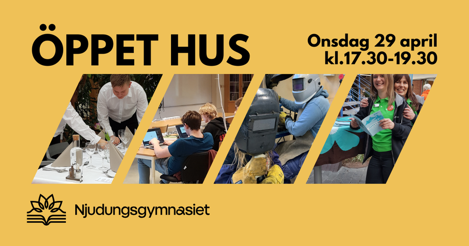 Onsdagen den 29 april 2026 kl. 17.30-19.30 har vi öppet hus på Njudungsgymnasiet. Kom och se vanliga och ovanliga lektioner. Lektionerna börjar kl. 17.30, 18.15 och 19.00 men du är välkommen att titta in när det passar dig.